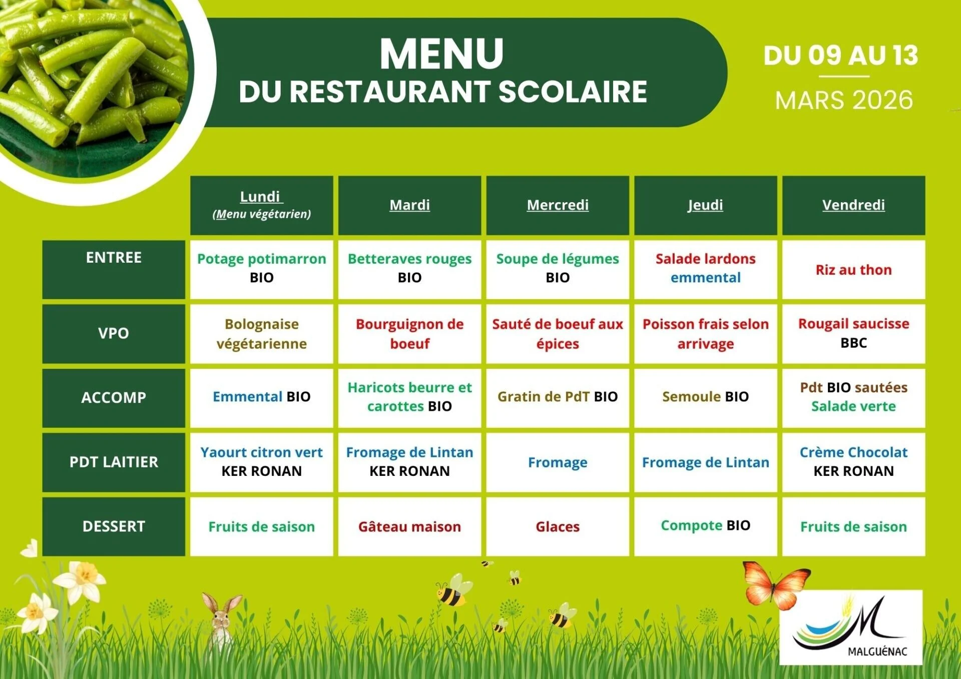 Retrouvez ci-dessous les menus des mois, ainsi que le règlement intérieur du restaurant scolaire.
